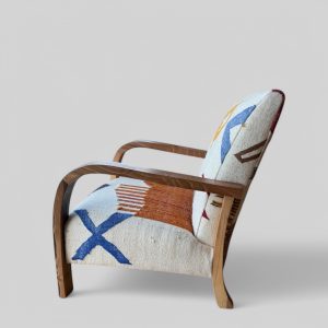 To preserve the charm of your walnut and vintage kilim armchair, regularly dust the fabric with a soft brush or a vacuum cleaner on low power, without a rotating brush. In case of stains, blot immediately with a clean, slightly damp cloth. Avoid the use of chemical or abrasive products.
