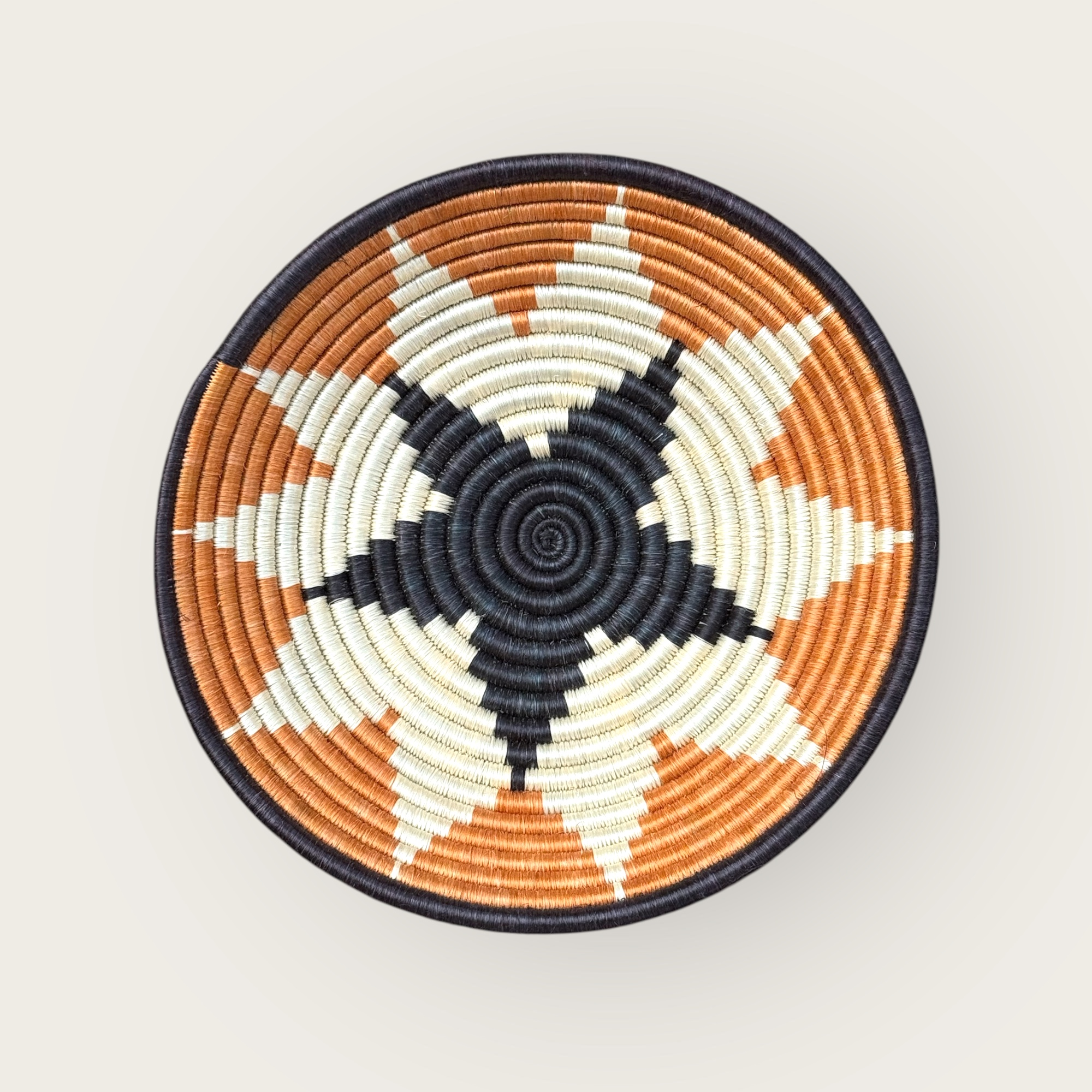 Intense, graphic, and powerful, the Umucyo basket is a real eye-catcher. Its eight-pointed star in deep black, ivory, and rust evokes the light of a Rwandan twilight. A powerful decorative object, both traditional and resolutely modern.