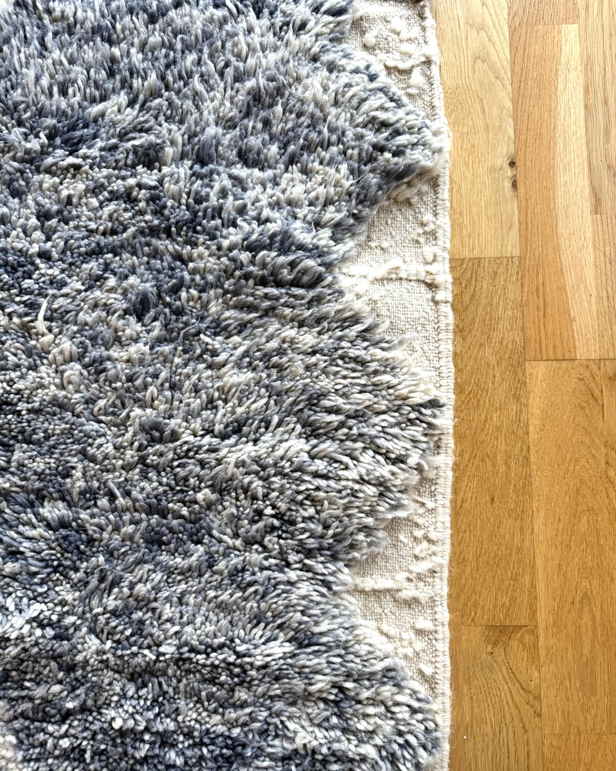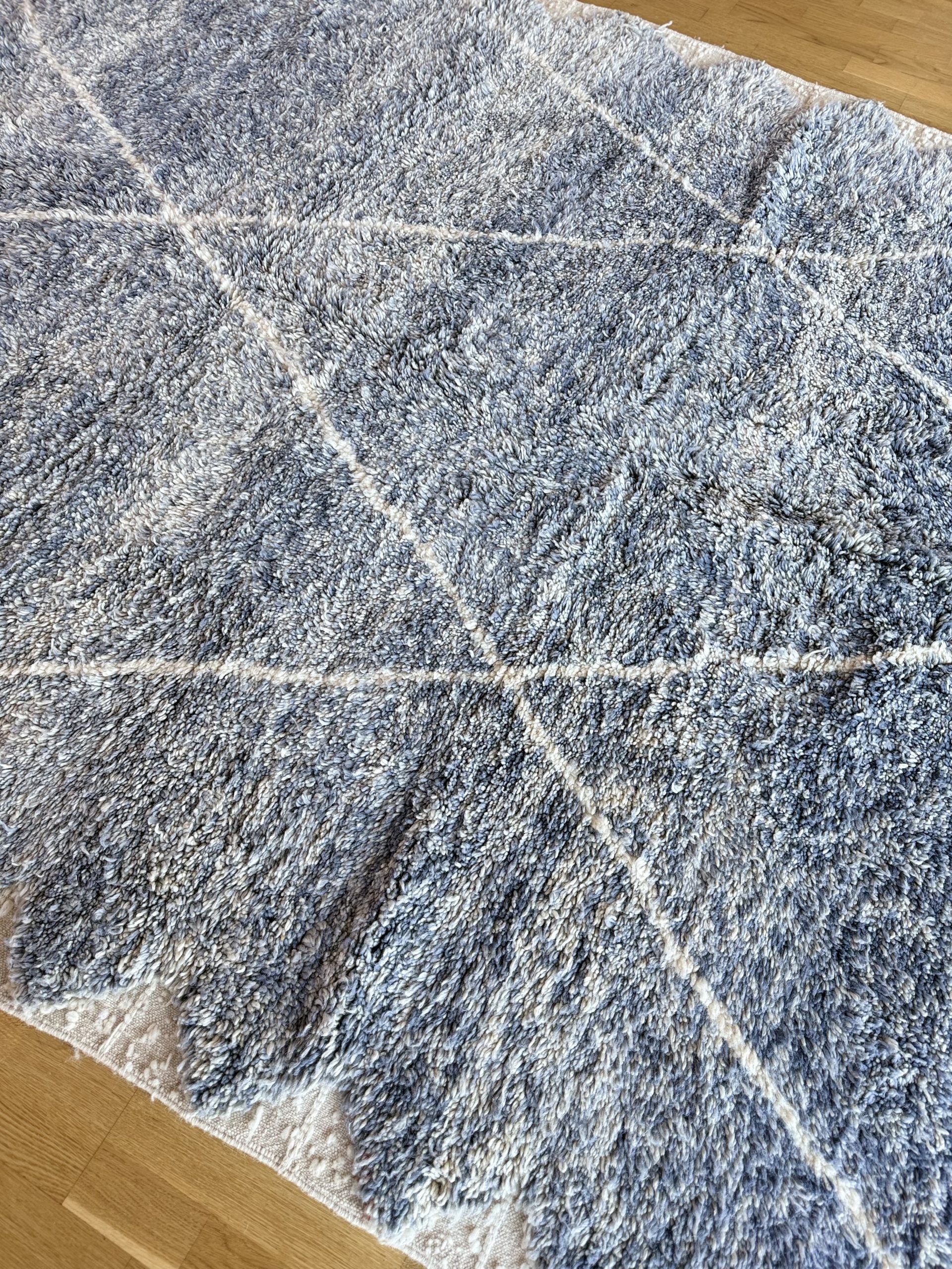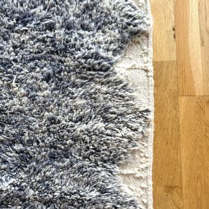 This rug evokes a cottony softness, a veiled sky or a morning mist… Its Beni Ouarain style revisited in blue tones is both soothing and contemporary.
