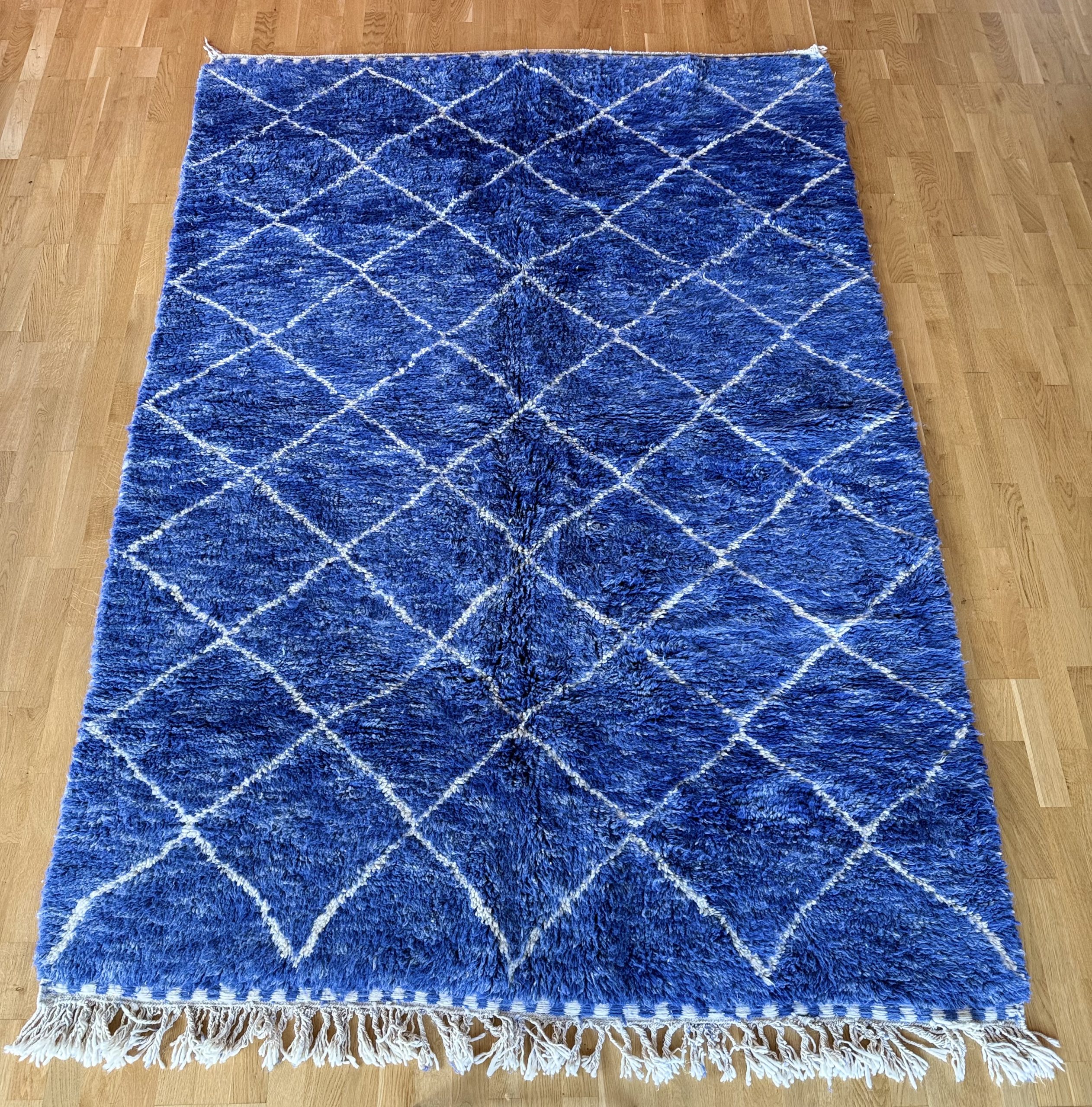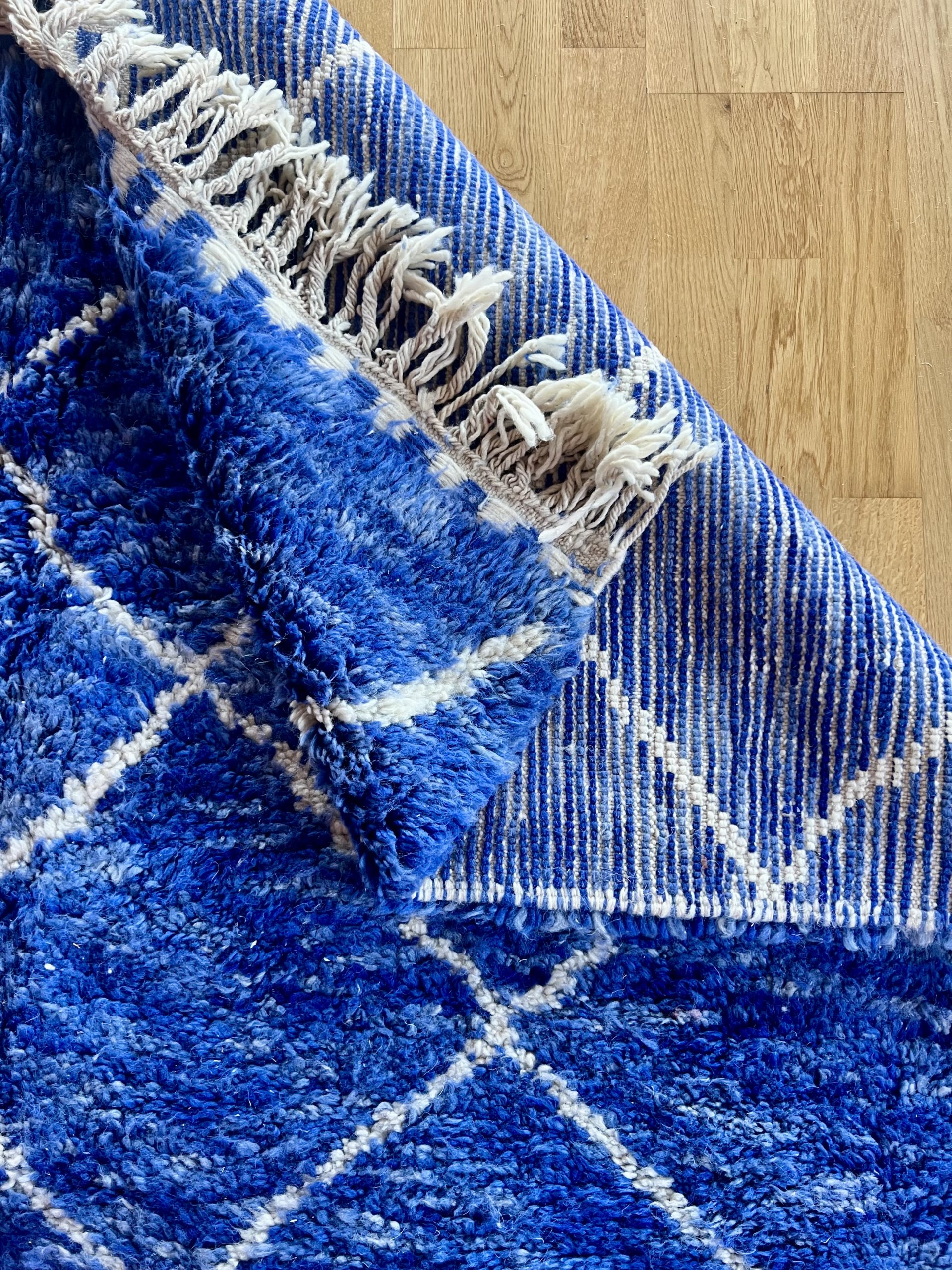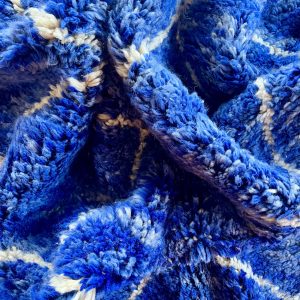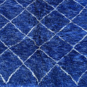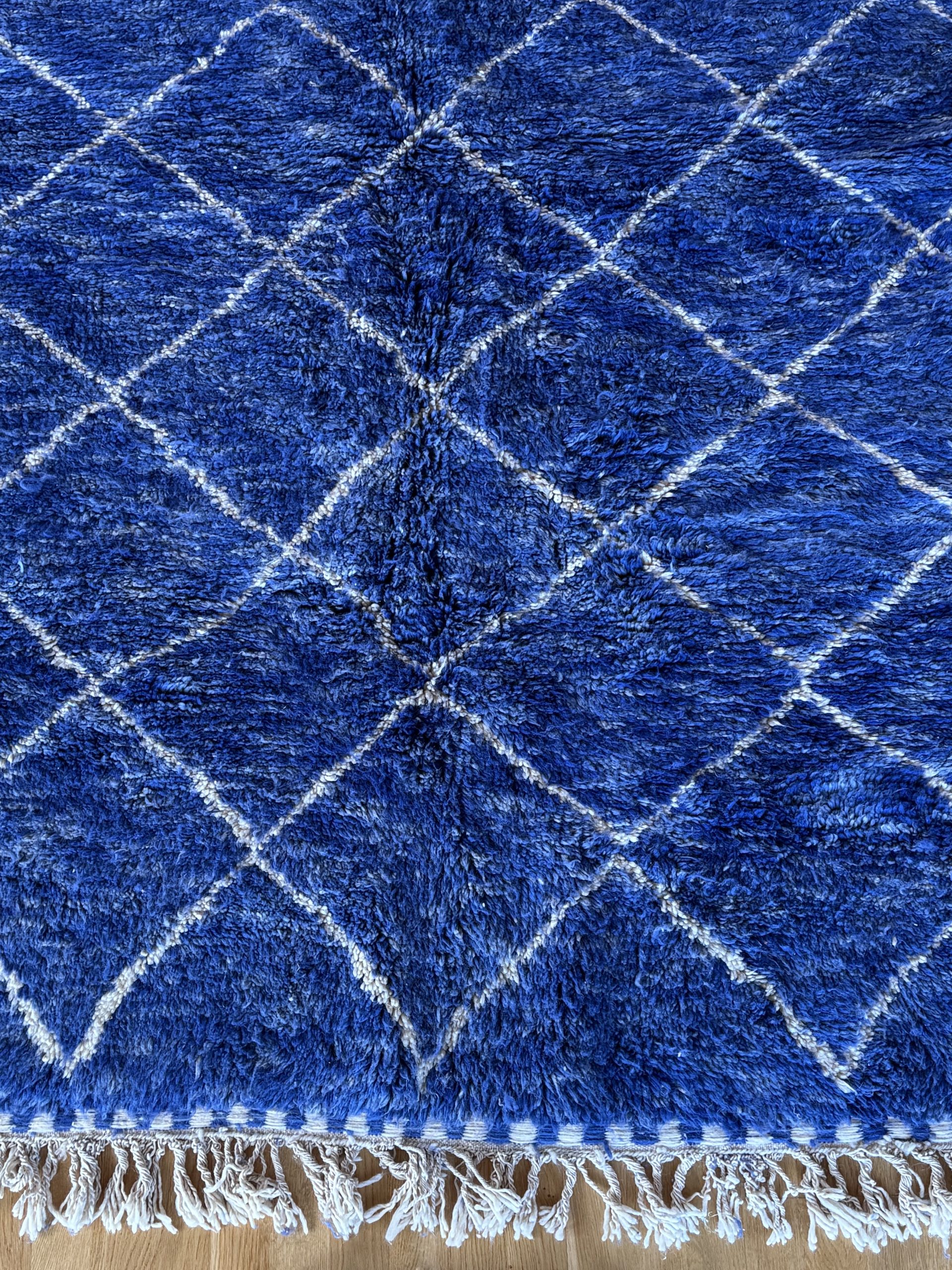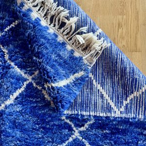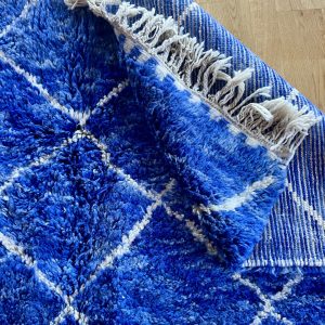 Immerse yourself in the captivating intensity of this Berber rug, where each shade of blue tells a story. From the deep blue of the starry night to the azure blue of Moroccan skies, through subtle indigo reflections, this hand-woven masterpiece captures the magic of color in all its forms.