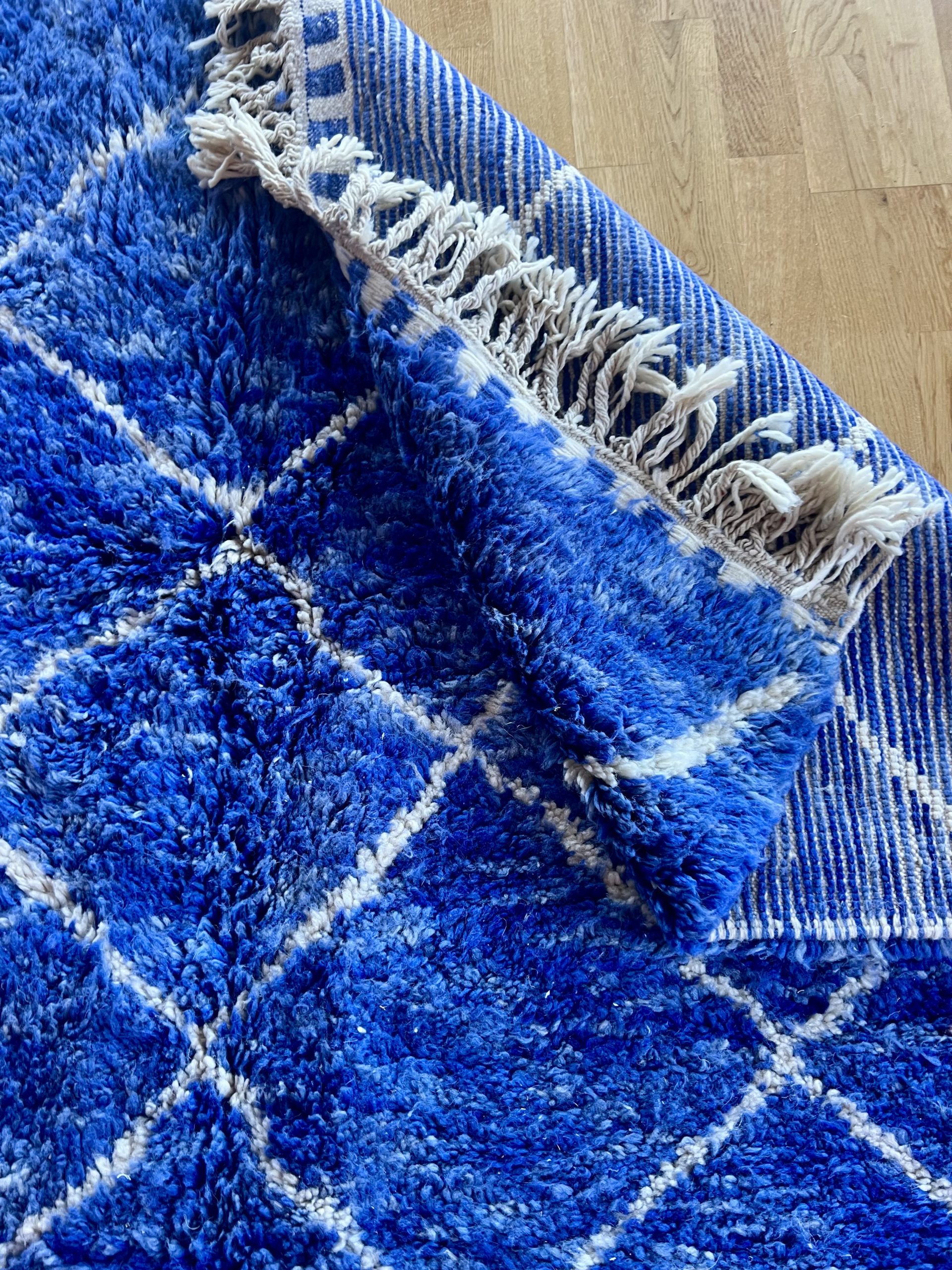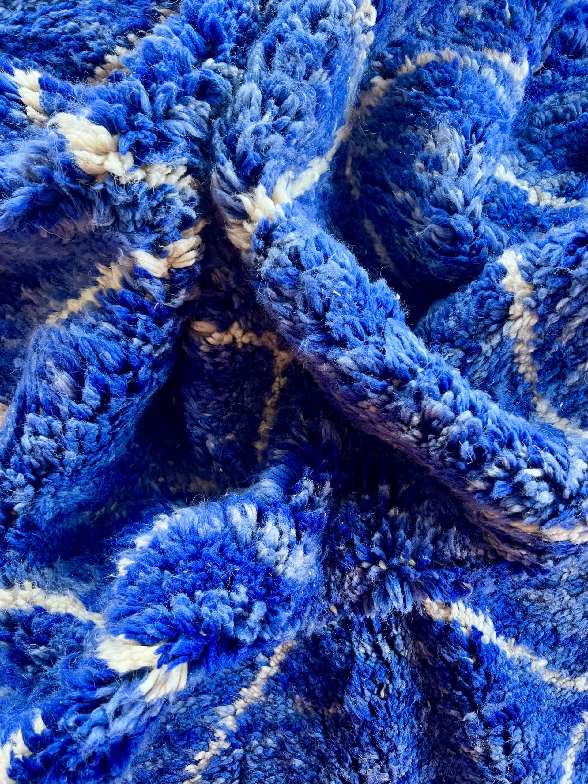 The intertwined diamonds of white threads delicately contrast with the vibrant blue, recalling the ancestral patterns of Berber tribes, symbols of protection and harmony. A unique piece, both contemporary and timeless, that will transform your space into a place full of character and serenity.
