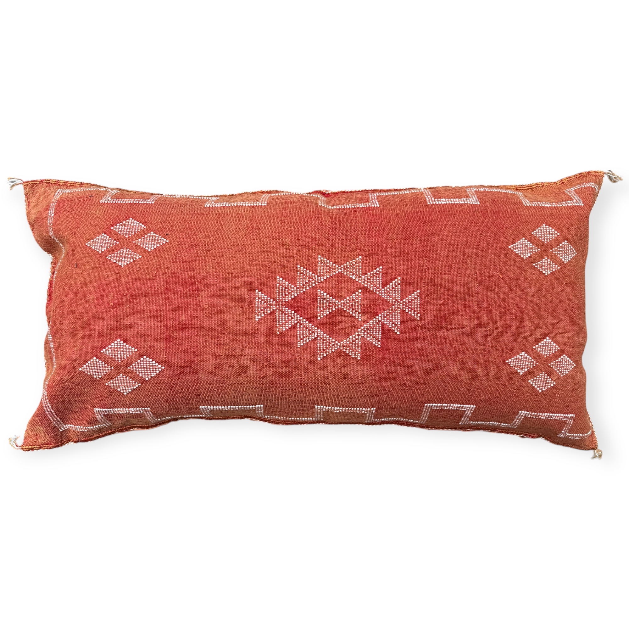The Afra cushion captures the warm, deep glow of a sunset over the Atlas Mountains. Its generous size and slightly distressed brick-red hue bring a warm intensity to your space, while its white Berber embroidery evokes symbols of guidance and light.