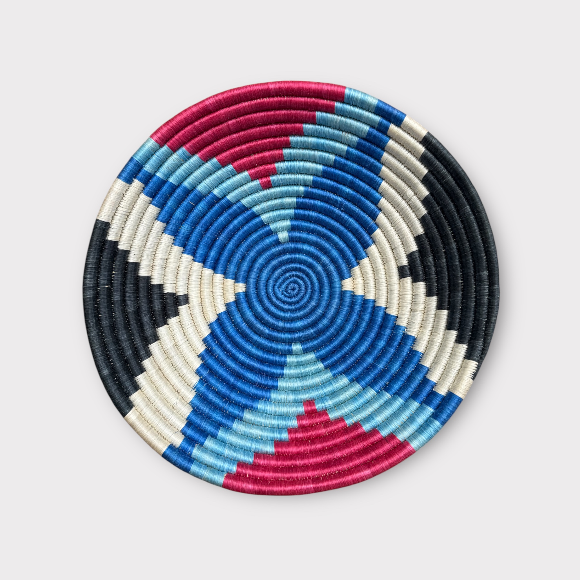 With its bold colors and bold geometric star, the Indatwa basket is a strong, statement piece. Its shades of blue, raspberry, ivory, and black create a vibrant contrast that instantly adds character and style to a wall.
